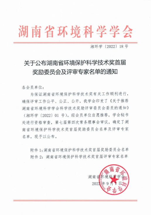 2022年9月7日,湖南省环境科学学会发布《关于公布湖南省环境保护科学技术奖首届奖励委员会及评审专家名单的通知》,必赢bwin线路检测中心技术总监胡胜入选湖南省环境保护科学技术奖首届评审专家名单。